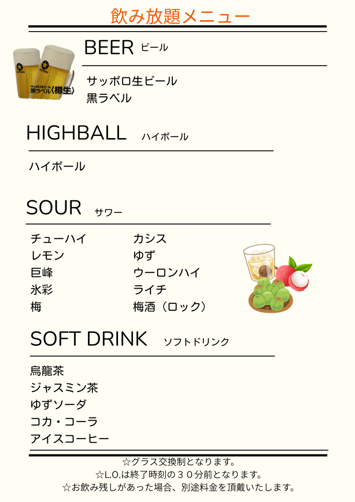 ⚫︎サラダ⚫︎唐揚げ&フライドポテト⚫︎サーロインステーキ⚫︎和牛カルビ焼き⚫︎当店自慢!ジンギスカン⚫︎ポークステーキ⚫︎胡瓜の浅漬け⚫︎ガーリック炒飯⚫︎氷菓⭐️飲み放題付(終了30分前ラストオーダー)ご滞在は2時間までとさせていただきます。